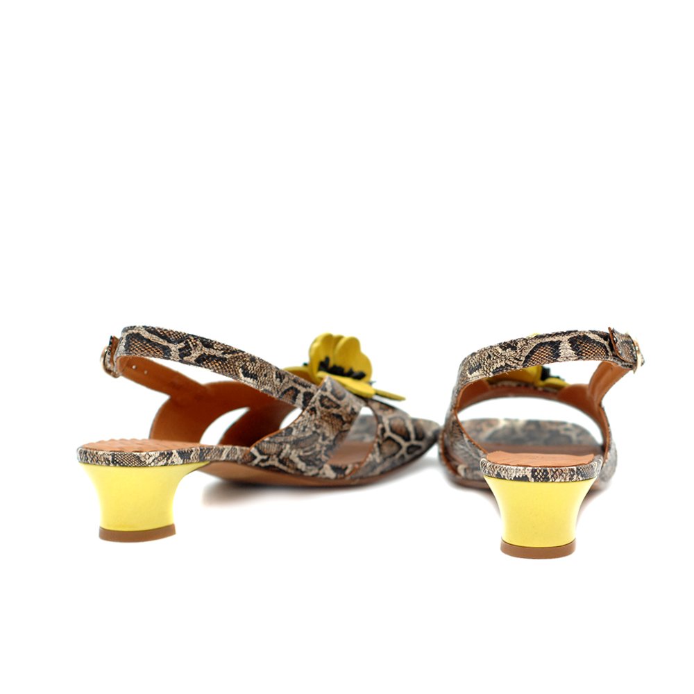 The Chie Mihara Yetina Sandals are the real standout sandals that will make all your looks unique and chic.  Made in Spain, these slingbacks feature premium leather quality and materials.  Furthermore, their main feature are the snake printed leather and a yellow flower on top. Moreover, their small heel are also covered with yellow patent leather. Meanwhile they offer a little height, they are still very comfortable with their square cut. Also, they feature the characteristic rubber patch on the leather sole for anti-skip purposes. In conclusion, you will wear these beautiful slingbacks with your outfits and definitely stand out!