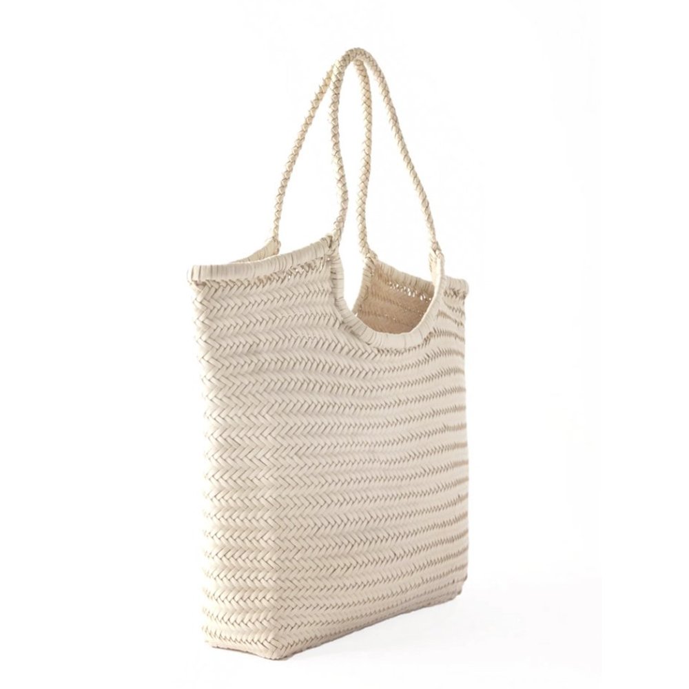 is a shoulder bag that stands out with its handwoven buffalo calf leather and stylish vertical design. It’s deep, unlined, and has an open top, making it easy to fit everything you need. The braided handles not only look great but are comfortable to carry too. This bag gives off Nantucket tote vibes but in a fresh, vertical twist. It’s perfect for anyone looking for a blend of casual elegance and practicality.