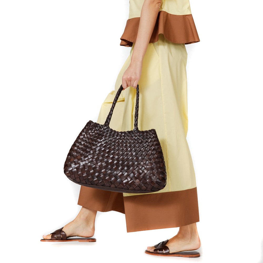 The soft calf in Dragon Diffusion Santa Croce Big Bordo Basket in tight-knit is complete with braided handles. Moreover, this roomy, unlined, open-top tote will be the perfect accompaniment to laid-back picnics beneath the summer sun. Also, irregular leather weaving straps that taper towards the brim characterize this elegant and chic bag! Its brown color is so versatile, that you can match it with everything from your day to night outfits! Furthermore, over time this bag will age and develop a natural patina that only traditional leather will give. Wear your Dragon Diffusion Santa Croce Basket to give a more stylish note to your outfits!